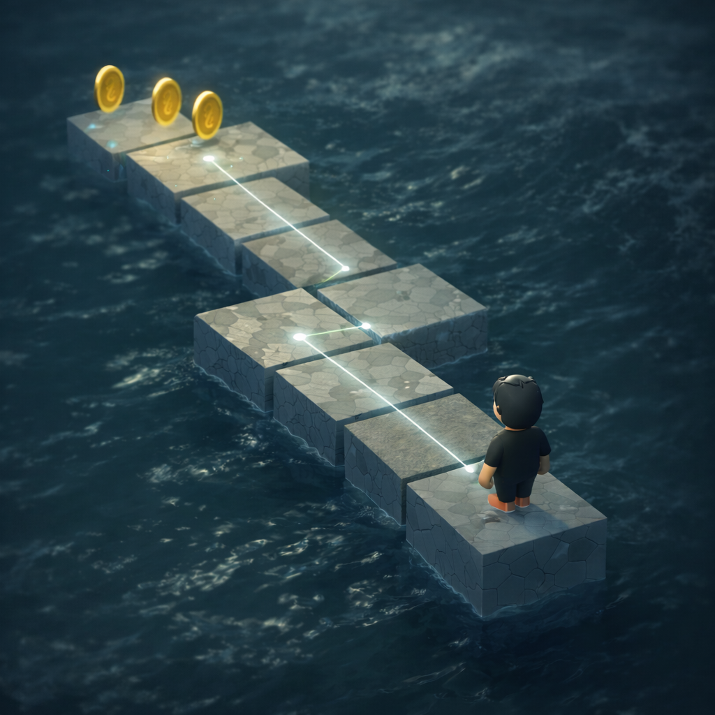 Zaplanuj algorytm, prowadź bohatera po kafelkach i zbierz wszystkie monety, unikając błędów i wpadnięcia do wody....